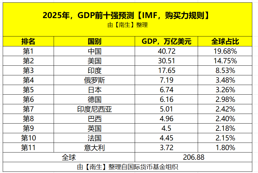 另外一个可能让部分人感到意外的排名是俄罗斯,在购买力平价规则下,2025年的GDP被评估为7.19万亿美元,全球占比3.48%,第四名——这主要得益于俄罗斯境内丰富的自然资源和内需市场。