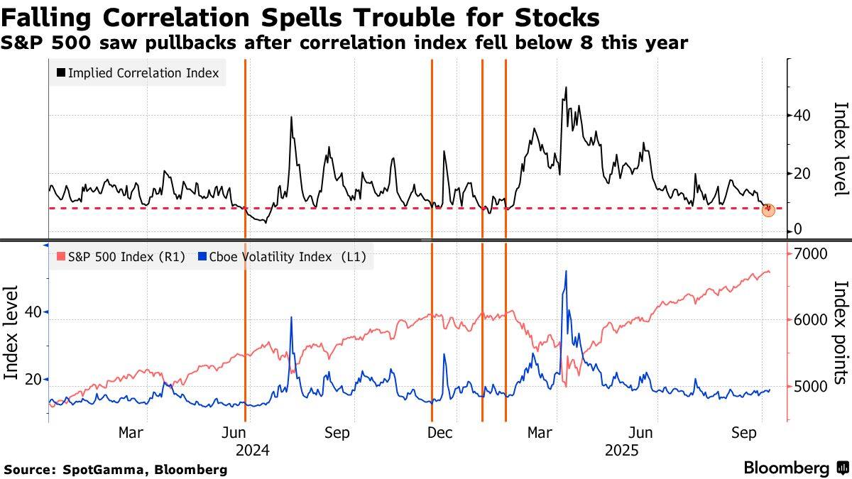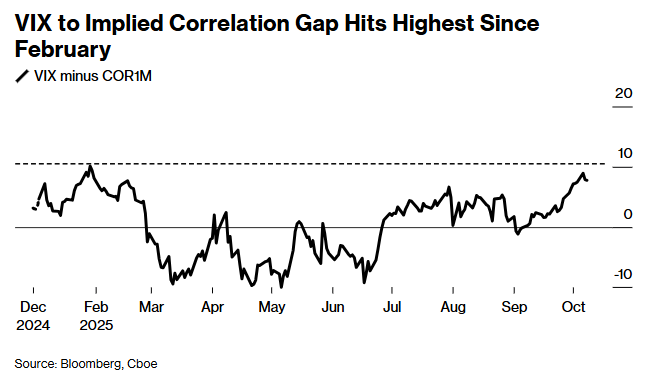 在过去两个月的大部分时间里,衍生品市场的相对平静一直是对此类担忧的有力反驳。芝加哥期权交易所波动率指数(VIX)持续远低于其长期平均值。与此同时,个股层面的波动彼此之间的相关性降至今年2月以来的最低水平,这在大多数市场观察者眼中是一个健康的迹象。