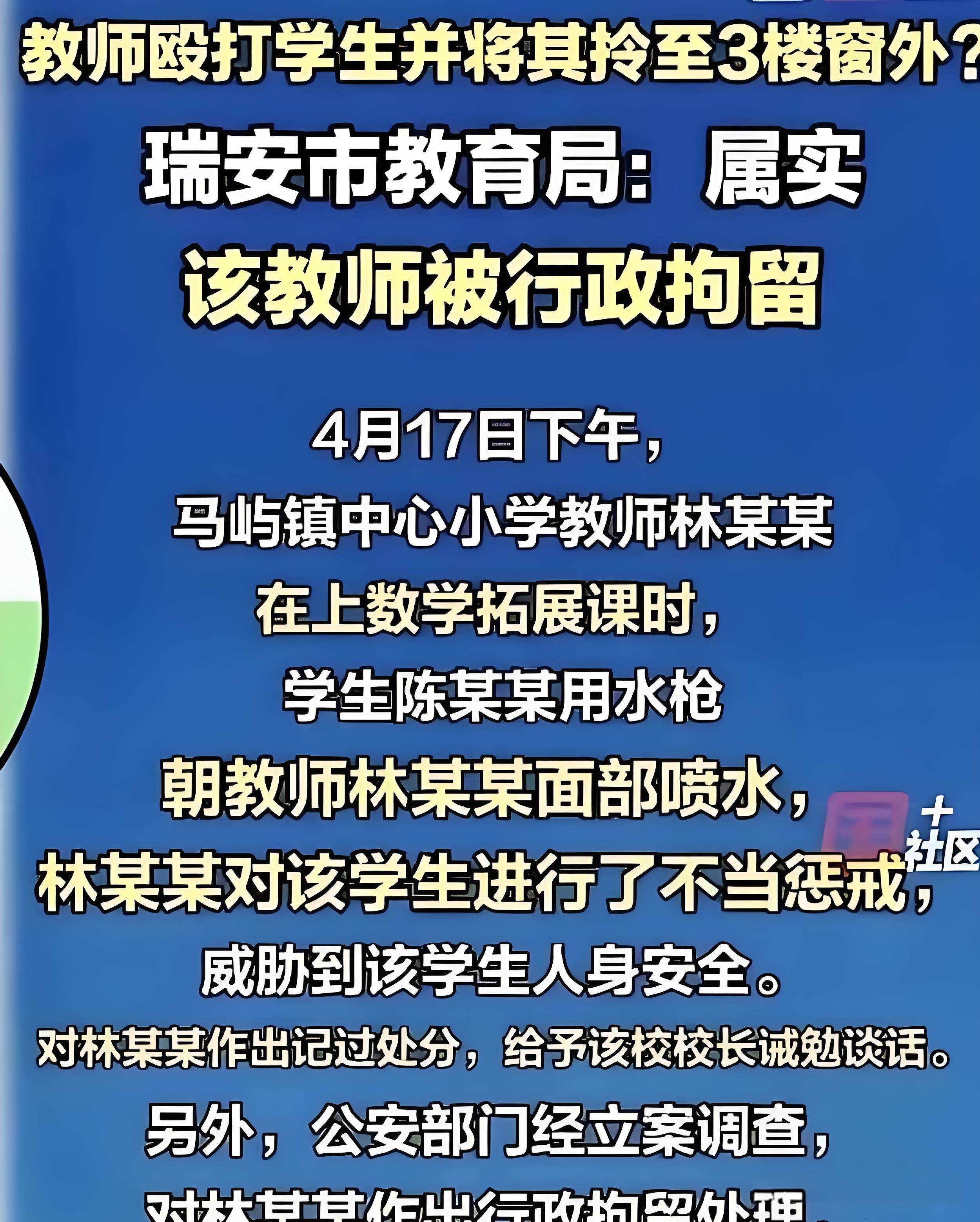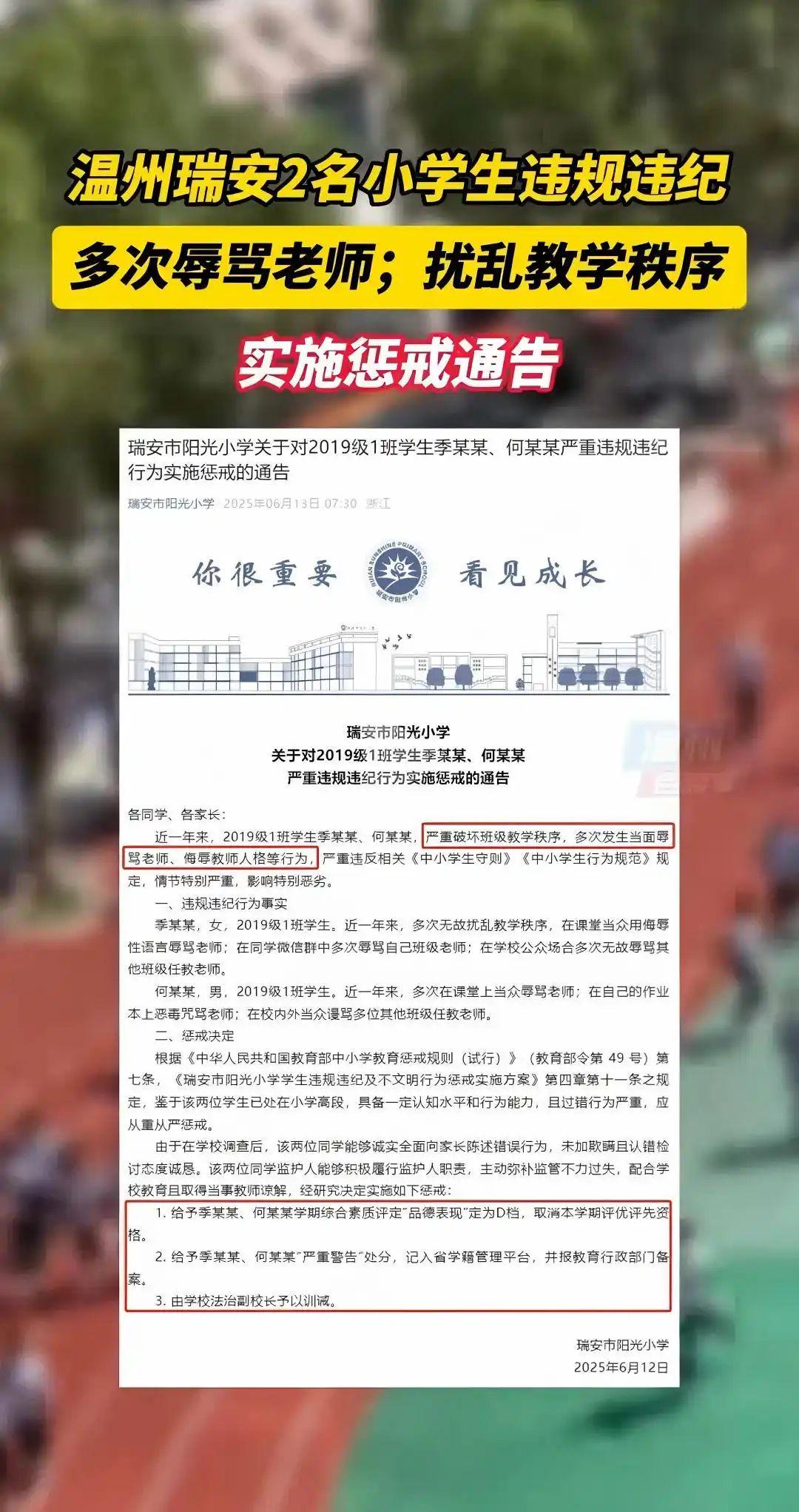 4月趣策略,瑞安市某小学林老师因将滋水挑衅的学生拎到窗边警告,被行政拘留十日,在教师群体中激起了长达两个月的涟漪。6月13日,同市另一小学对两名长期辱骂教师的学生作出“顶格”处分——品德计D档、取消评优、警告记入学籍档案。两起事件形成的强烈反差,将教育惩戒权的撕裂现状推向舆论焦点。